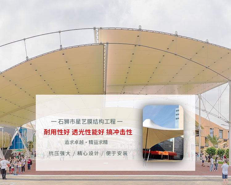 自创立以来,我们发挥了专门规模的生产优势,坚持以“追求卓越,精益求精”的经营理念赢得了广大客户的高度信任。   公司为创建行业的良好企业,生产良好产品,提供良好服务,我们采用以人为本的管理理念,培养了一批经验丰富的工程技术人员和营销人员;公司将 “追求卓越,精益求精” 的经营理念贯穿到产品生产的全过程,用先进专业制造设备生产,选用优质材料,引进先进的生产工艺,做到产品规格齐全、品种多样、合理适用等特点;公司把“ 用户的满意是我们的追求 ” 作为对用户的承诺,尽努力来满足用户各种需求的同时,也为用户提供个性化的服务,将用户的理想与追求变为现实。   石狮市星艺膜结构工程愿与广大有识之士建立互惠互利,共同发展的合作关系,携手合作,竭诚欢迎新老客户亲临指导、洽谈业务!愿与广大有识之士建立互惠互利,共同发展的合作关系,携手合作,竭诚欢迎新老客户亲临指导、洽谈业务!